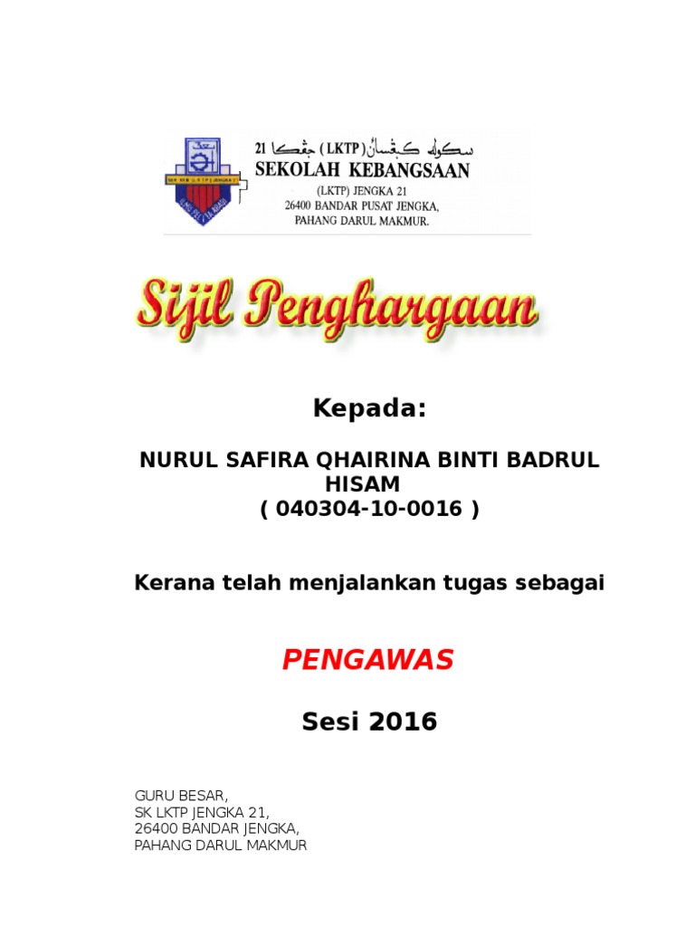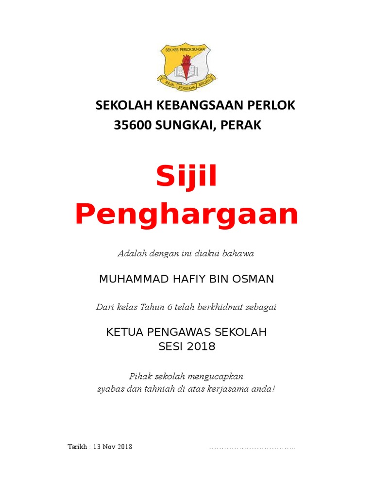 Sijil penghargaan dengan setulus ikhlas merakamkan setinggi penghargaan kepada muhammad izuan bin ibrahim. Interested in flipbooks about PENGAWAS SEKOLAH. SEKOLAH MENENGAH KEBANGSAAN LIBARAN SANDAKAN Dengan ini disahkan bahawa pelajar berikut telah menghadiri dan lulus Kursus Kepimpinan yang.